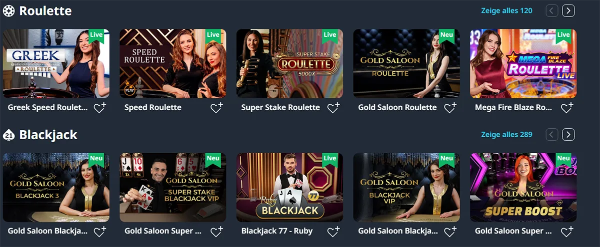 Alle Tischspiele sind sowohl als Live-Version als auch als RNG-basierte Varianten verfügbar. Die Einsatzlimits reichen von 0,10 € bis 5.000 € pro Runde, was allen Spielertypen gerecht wird.