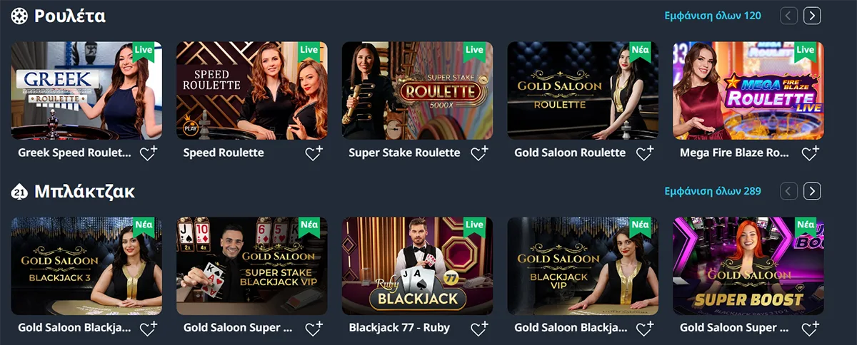 Με την υποστήριξη κορυφαίων παρόχων του κλάδου, όπως η Evolution Gaming και η Ezugi, το λόμπι του live καζίνο προσφέρει μια μεγάλη ποικιλία από κλασικά επιτραπέζια παιχνίδια, όπως ρουλέτα, μπλακτζάκ, μπακαρά και παραλλαγές πόκερ.