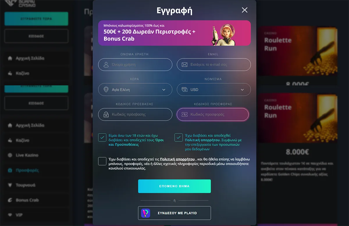 Διαδικασία δημιουργίας λογαριασμού Buran Casino