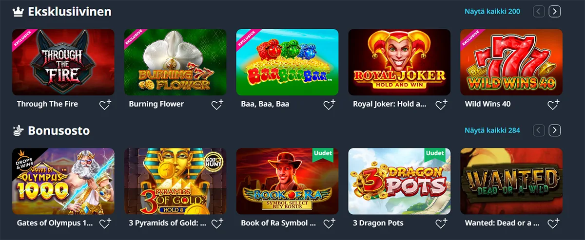 NetEnt-pelit kuten Starburst ja Gonzo's Quest ovat asiakkaiden suosikkeja. Pragmatic Play tarjoaa Sweet Bonanza ja Gates of Olympus -pelit suurilla voittomahdollisuuksilla.