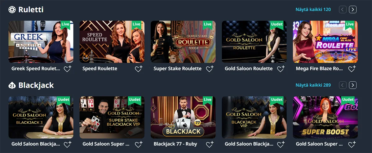 Blackjack-pöydissä pelaat ammattitaitoisia jakajia vastaan. Speed Blackjack ja Infinite Blackjack mahdollistavat nopean pelaamisen.
