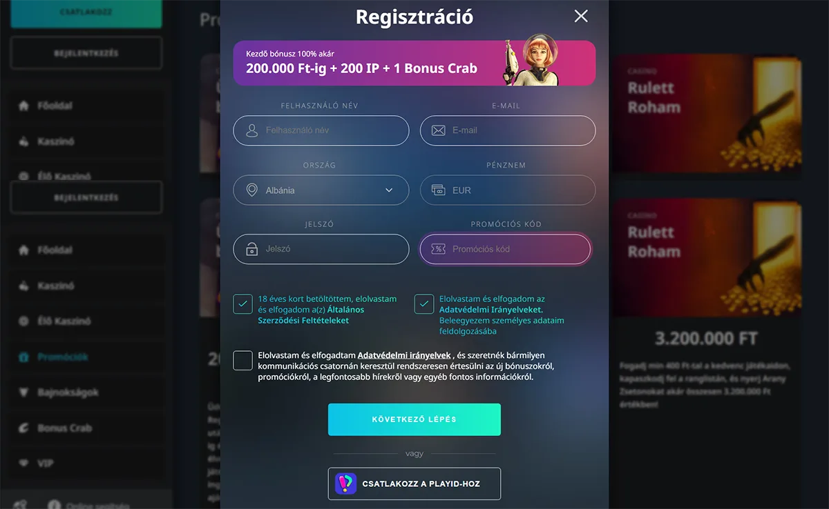 A regisztráció során szigorú személyazonosság ellenőrzést végzünk. Érvényes személyigazolvány, útlevél vagy vezetői engedély feltöltése kötelező a fiók aktiválásához.