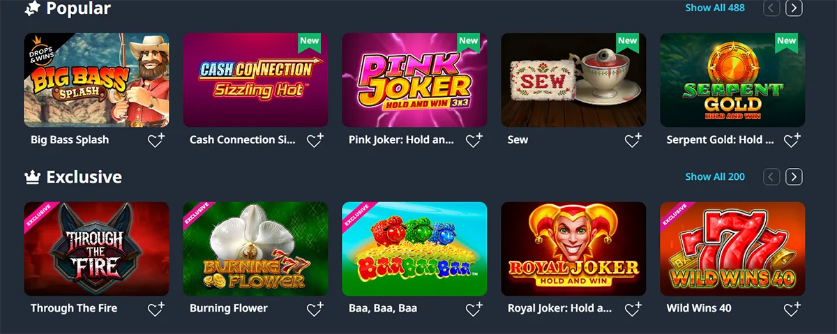 Klassiska favoriter frÄn NetEnt dominerar spelutbudet med titlar som Starburst och Gonzo's Quest. Dessa svenska spelautomater erbjuder RTP pÄ över 96% och stabil Äterbetalning.